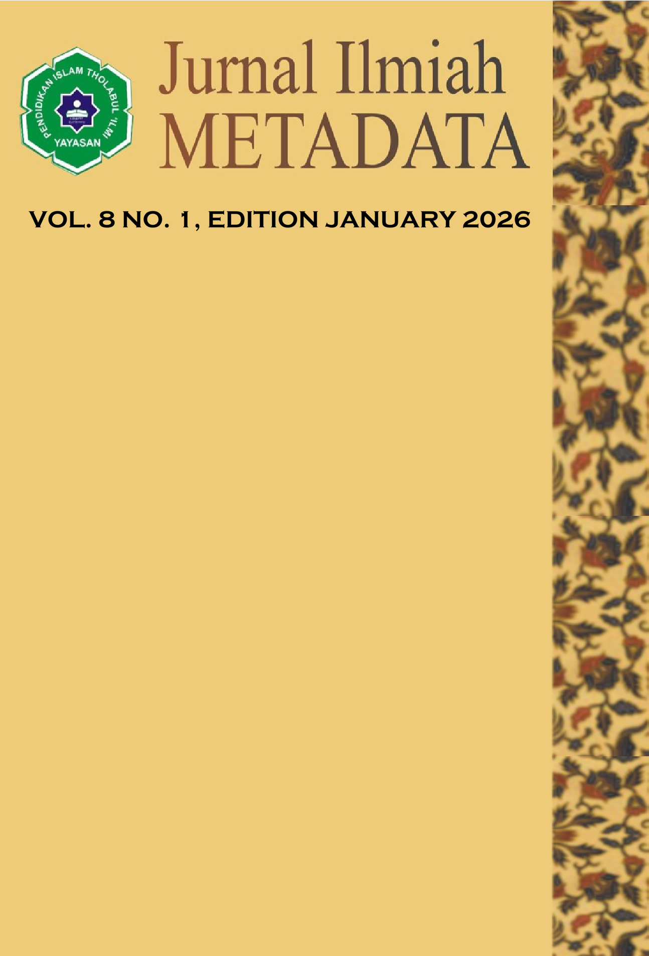 Vol. 8 No. 1 (2026)Jurnal Ilmiah METADATA is a journal to managed of Yayasan Pendidikan Islam Tholabul Ilmi, for aims to serve as a medium of information and exchange of scientific articles between teaching staff, alumni, students, practitioners and observers of science in education, Sains, Social, Technology and Humaniora. Focus ans Scope: Education, Management, Law, Sains, Social, Technology and Humaniora. Jurnal Ilmiah Metadata editor receives scientific articles of empirical research and theoretical studies related to Education, Management, Law, Sains, Social, Technology and Humaniora sciences that certainly have never been published. Published third a year in January, May and September. P-ISSN: 2745-5262 , E-ISSN: 2723-7737
