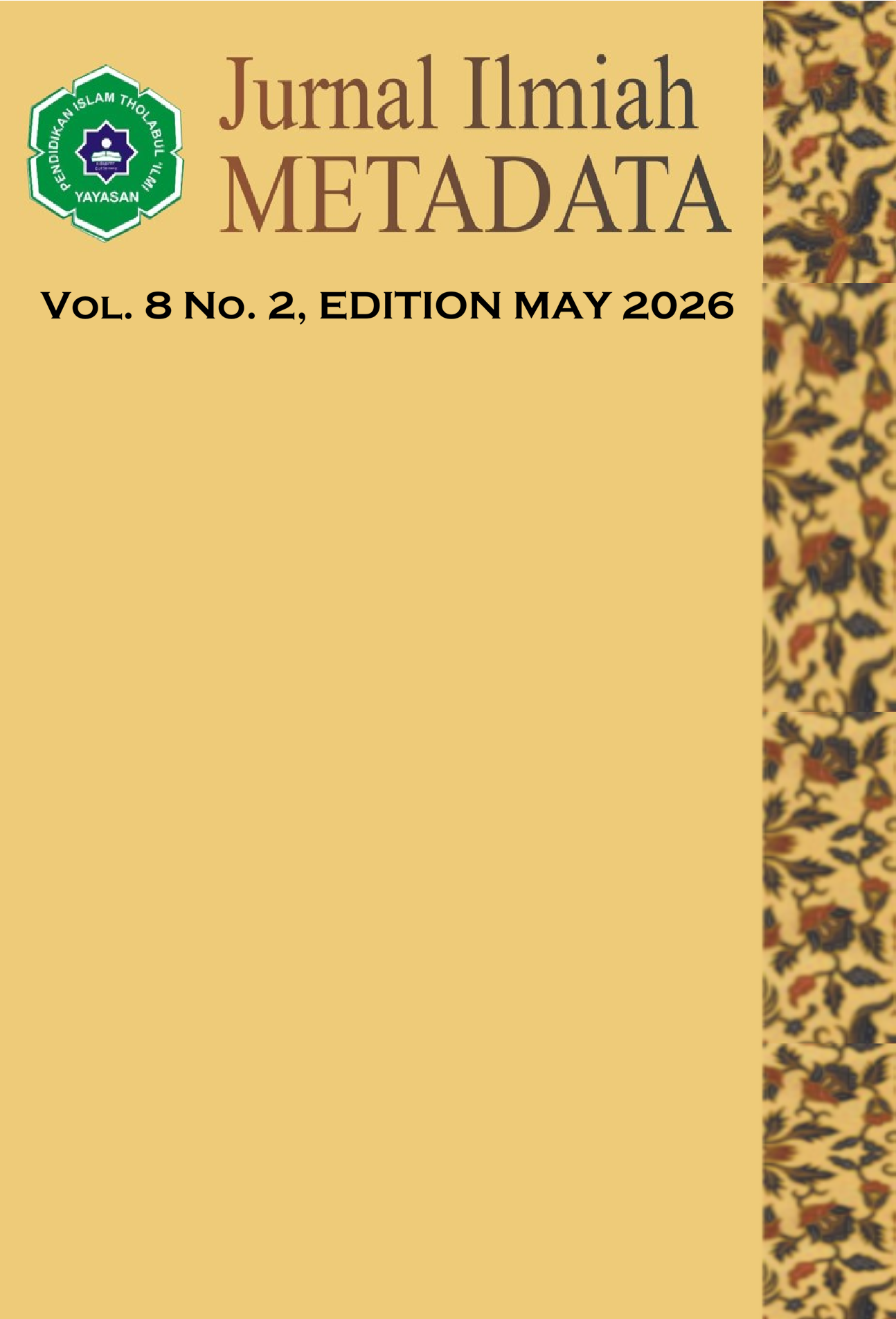 Vol. 8 No. 2 (2026)Jurnal Ilmiah METADATA is a journal to managed of Yayasan Pendidikan Islam Tholabul Ilmi, for aims to serve as a medium of information and exchange of scientific articles between teaching staff, alumni, students, practitioners and observers of science in education, Sains, Social, Technology and Humaniora. Focus ans Scope: Education, Management, Law, Sains, Social, Technology and Humaniora. Jurnal Ilmiah Metadata editor receives scientific articles of empirical research and theoretical studies related to Education, Management, Law, Sains, Social, Technology and Humaniora sciences that certainly have never been published. Published third a year in January, May and September. P-ISSN: 2745-5262 , E-ISSN: 2723-7737